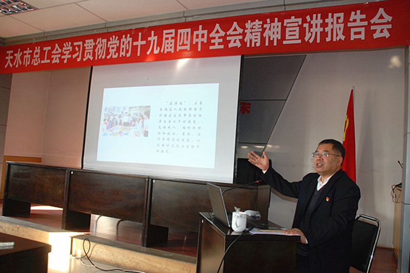 1月7日,天水市總工會學習貫徹黨的十九屆四中全會精神宣講報告會在星火機床公司舉行,天水市總工會邀請中共天水市委宣講團成員、甘肅林業職業技術學院教授謝小平為星火機床公司黨支部書記、分會主席和部分員工作了《以制度優勢托起人民獲得感、幸福感、安全感》為主題的黨的十九屆四中全會精神學習專題宣講報告。天水市總工會黨組成員、副主席張虎琴,副主席衡俊強,星火機床公司黨委副書記、工會主席蔣俊及各黨支部書記、分會主席和部分員工80多人參加了報告會。衡俊強主持報告會。