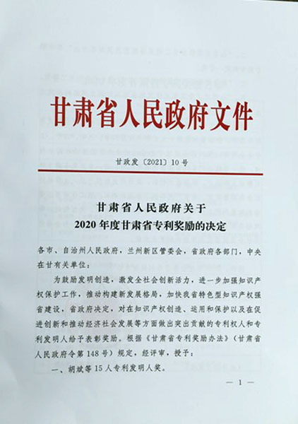 日前,甘肅省人民政府下發的《甘肅省人民政府關于2020年度甘肅省專利獎勵的決定》(甘政發【2021】10號)文件指出,為鼓勵發明創造,激發全社會創新活力,進一步加強知識產權保護工作,推動構建新發展格局,加快我省特色型知識產權強省建設,省政府決定,對在知識產權創造、運用和保護以及促進創新和推動經濟社會發展等方面做出突出貢獻的專利權人和專利發明人給予表彰獎勵。