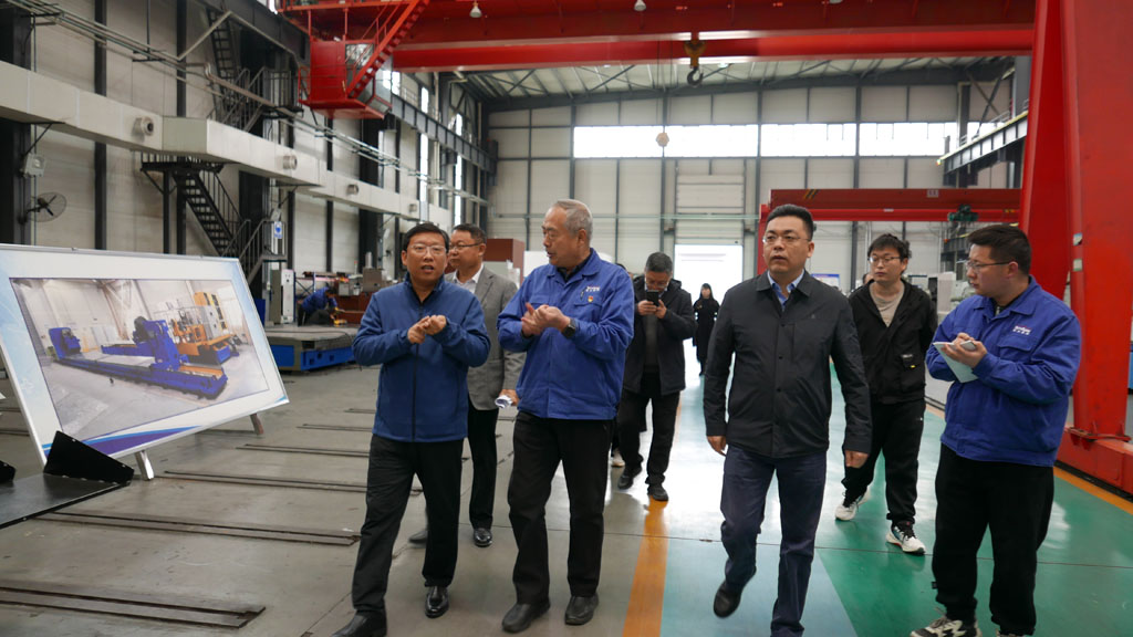 在星火機床公司裝配生產現場,集團公司副總經理、星火公司總經理趙錦銘向張朝洋一行詳細介紹了公司歷史沿革、生產經營、產品研發、項目建設等情況,并陪同參觀了公司自主研發的各類大、重型數控機床產品,以及即將亮相北京國際機床展會的三臺展機。