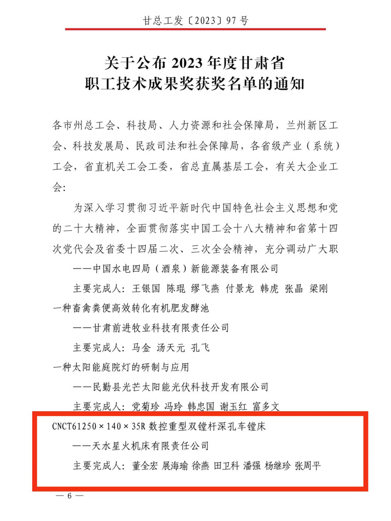 日前,省總工會、省科學技術廳、省人力資源和社會保障廳聯合公布了第十六屆(2023年)甘肅省職工優秀技術創新成果獲獎名單,星火機床公司董全宏、展海瑜等人完成的CNCT61250×140×35R 數控重型雙鏜桿深孔車鏜床榜上有名,榮獲二等獎。