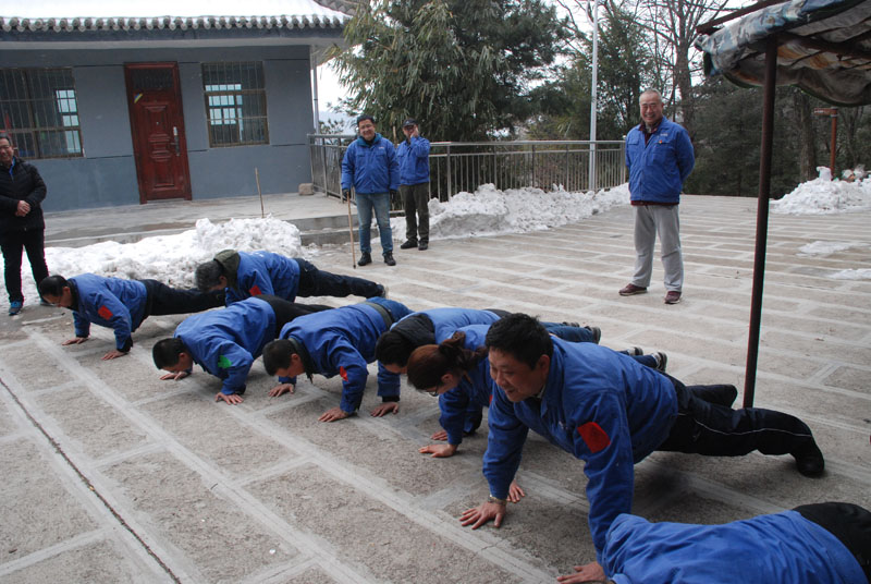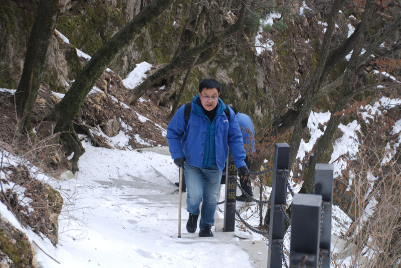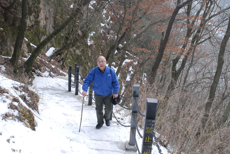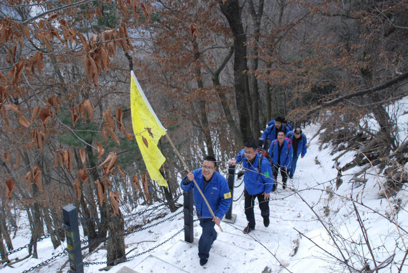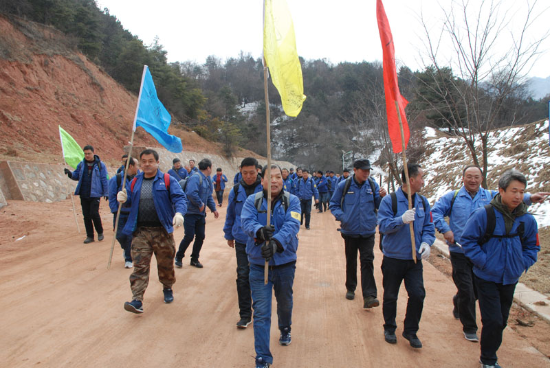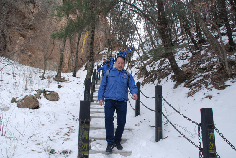 一切安排就緒,隊(duì)員們朝著山頂出發(fā)。山里的天氣較之外面更為寒冷,爬山的過程中還不時(shí)有雪花飄落,上山的臺(tái)階上堆積了一層薄冰,增加了爬山的難度。盡管如此,大家爭先恐后,竭盡全力,直奔目標(biāo)。熱情的回聲打破了山谷的寂靜,冰冷的空氣仿佛也有了熱度。10公里的上坡及上山,對(duì)平時(shí)鍛煉不足的人來說確實(shí)是極大的考驗(yàn),爬山過程中,大家相互鼓勵(lì)、互相扶持,幾位年紀(jì)偏大或身體不適的隊(duì)員克服了困難,堅(jiān)持爬到山頂,決不放棄。